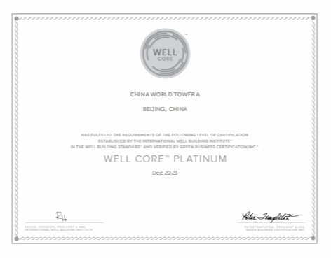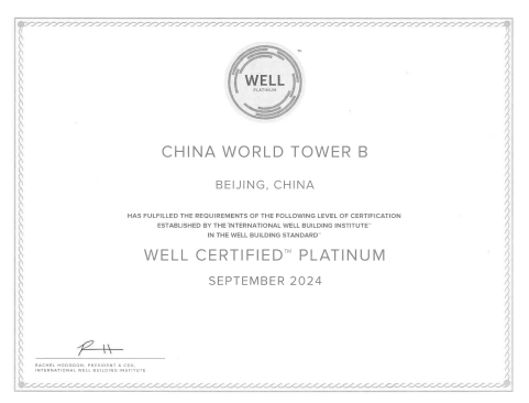 China World Tower A and China World Tower B have been awarded WELL (CORE & SHELL) platinum certification by International WELL Building Institute
