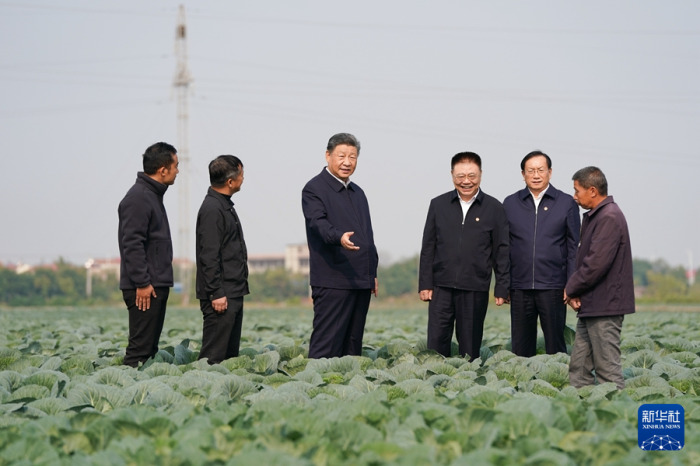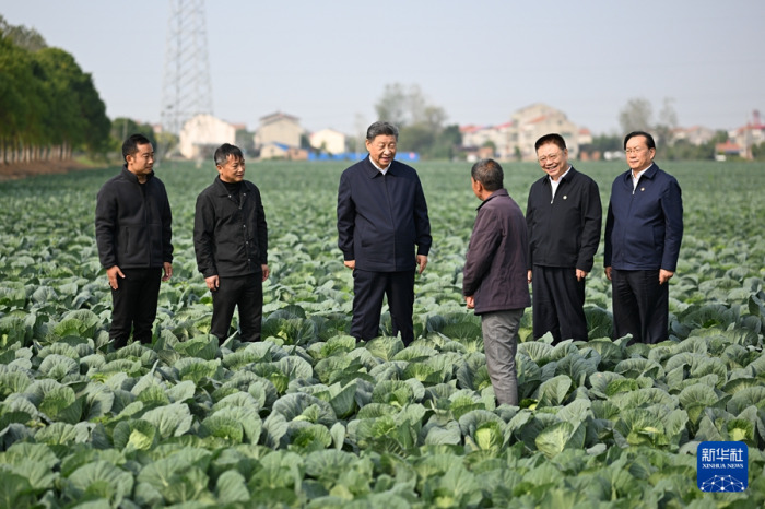 5日上午,习近平前往咸宁市嘉鱼县,首先到潘家湾镇十里蔬菜长廊考察。深秋时节,这里仍然满目青翠、生机勃勃。习近平走进田间,察看蔬菜长势,详细询问蔬菜品种、种植技术、销售等情况。他强调,农村天地广阔,农业大有可为。发展现代农业,建设农业强国,必须依靠科技进步,让科技为农业现代化插上腾飞的翅膀。他勉励当地干部群众走科技之路、质量之路、品牌之路,把蔬菜种植这个富民产业进一步做好,让更多群众增收致富。