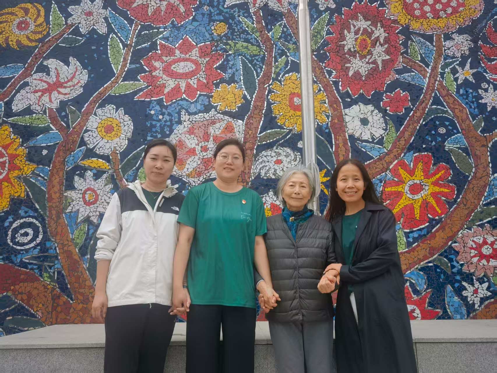 在蒲公英中学,慰问团代表有幸偶遇叶蕾蕾老师,并在其设计的艺术墙前合影留念。作为一名老艺术家和社区创新者,叶老师在蒲公英中学践行“从环境到心灵”的艺术转换理念,把老校区从一个旧工厂转换为色彩斑斓、处处散发艺术气息和生命力的美丽校园。