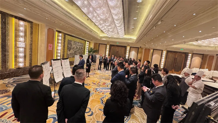 面对亚投行年会这一国际盛事,中国大饭店全体同仁以高度的责任感和使命感投入筹备工作。管理层特别成立专项小组,对参与服务的全体员工进行了系统化培训与全面动员,从服务礼仪到食品安全,从流程规范到应急处理,确保每位服务人员都能以最专业的素养展现中国酒店业的卓越水准。在接到主办方三次紧急调整参会人数的通知(800人→1400人→1600人)后,各团队展现出惊人的执行力:采购团队连夜调配优质食材,工程团队48小时不眠不休完成场地电力改造,餐饮部迅速集结283名服务精英,共同应对这一重大挑战。