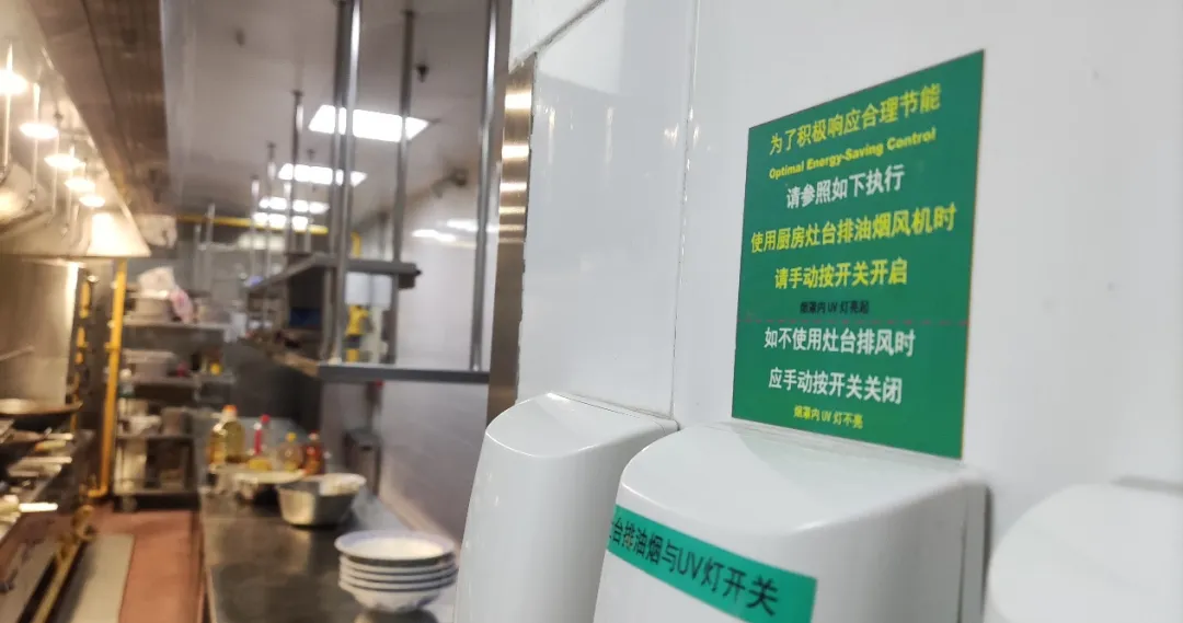 酒店深知节能减排不仅是技术改造的问题,更需要全体员工的共同努力。在员工工作区域,新国贸饭店通过张贴节能提醒标语,倡导员工合理用电。例如,厨房灶台的排油抽风机设置了手动开关提醒,避免无人使用时设备长时间空转。同时,洗手间张贴节水及节约用纸的标识,进一步提高员工环保意识。