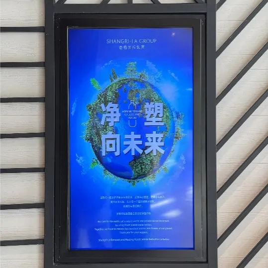 作为社会的重要一员,新国贸饭店深知传播环保理念的重要性,并通过多种形式向客人倡导节能减排。在酒店大堂,LED屏幕滚动播放“净塑向未来”的宣传片,号召公众减少塑料制品使用。办公室桌面摆放的环保宣传牌,同样在无形中向客人传递绿色理念。