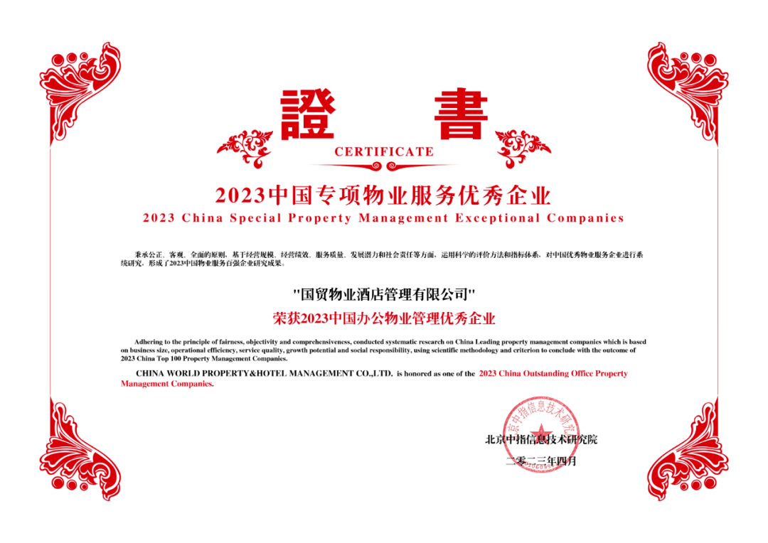 在此次活动中,国贸物业酒店管理有限公司凭借在高端物业服务的实践经验和核心竞争优势,荣获“2023中国高端物业服务领先企业”、“2023中国专项物业服务优秀企业-商业物业管理”、“2023中国专项物业服务优秀企业-办公物业管理”等多项荣誉。