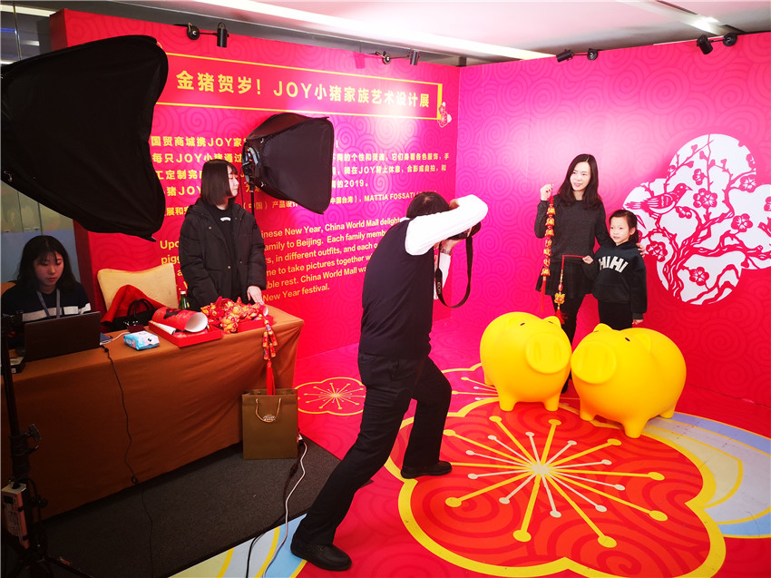 春节期间,国贸商城特邀国内外设计师定制涂装打造JOY小猪家族展,并在商城公共区域展出。与此同时,由摄影协会向国贸商城提议,在展览区内举办“金猪送福拍拍全家福活动”,国贸中心摄影协会的志愿者们在此期间为客人免费拍摄喜庆的全家福,记录客人全家的美好瞬间。随即,国贸商城快速响应,准备了适合拍照的精美场景以及配合道具。