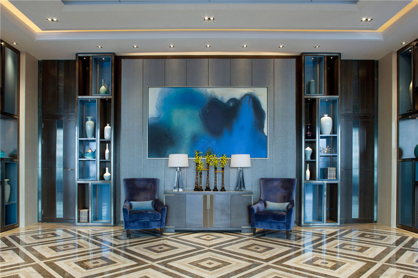 从标志性大堂到豪华阁楼层,客人们由嵌有香槟色丝绸镶板的电梯间开始,感受用胡桃木精心雕琢的客房。明亮的灯光下,地毯上隐喻财富的金色“水流”映衬出象征闾巷交错的网格图案,柔软而温馨;象牙色调的巷道式走廊将人们引向他们的居所。