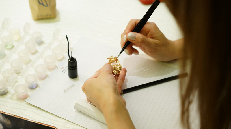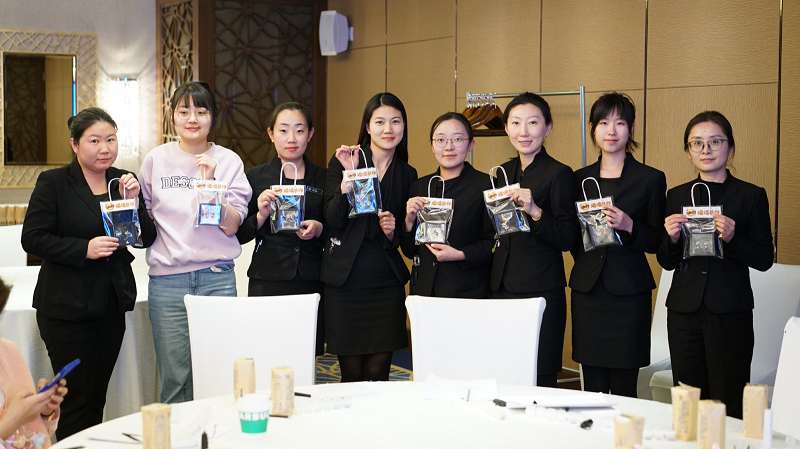 在实际操作环节,女员工们早已按捺不住内心的期待,迫不及待地开始动手创作。活动现场摆放着各种螺钿制作工具和材料,如十六色贝壳、胶水、饰品模具等。几位老师穿梭在女员工之间,耐心地指导她们如何将细小的贝壳精心镶嵌在饰品模具上。女员工们展现出了极高的热情和创造力,每个人都专注于自己的作品,从最初的构图到小心翼翼地将螺钿片粘贴,再到最后的细节修饰,每一个步骤都倾注了她们的心血。