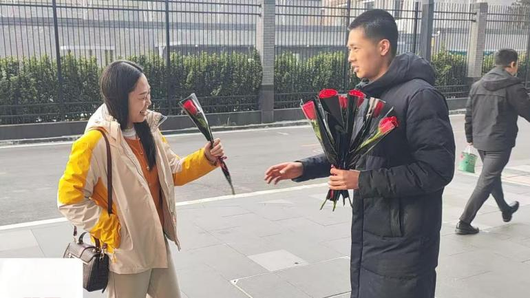 3月8日当天,提前准备好的物业工作人员早早地站在大厦入口处,手捧鲜花,笑容满面地等待着每一位女性业主的到来。当业主们踏入大厦时,工作人员便热情地将花束递到她们手中,并送上一句真挚的“妇女节快乐”。接过鲜花的业主们惊喜不已,脸上洋溢着灿烂的笑容,不少人当场与物业工作人员合影留念,记录下这一温馨时刻。