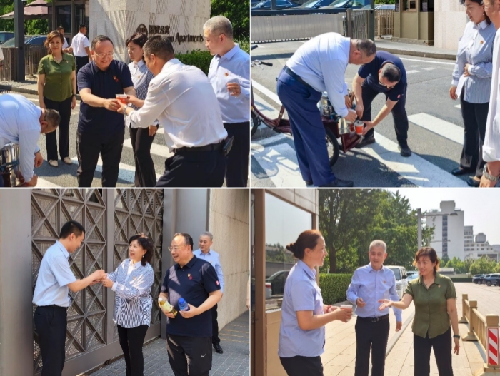 近日,京城持续高温,气温一度攀升至40℃。在酷暑难耐的环境下,国贸中心的保安员们依然坚守岗位,奋战在室外巡逻执勤一线,全力守护国贸院内安全稳定。为切实关心关爱一线员工身心健康,6月24日下午,国贸中心党委开展“送清凉”慰问活动,中心党委领导班子成员亲自将绿豆汤等防暑饮品送到户外执勤人员手中,并叮嘱大家注意劳逸结合,确保工作安全和身体健康。